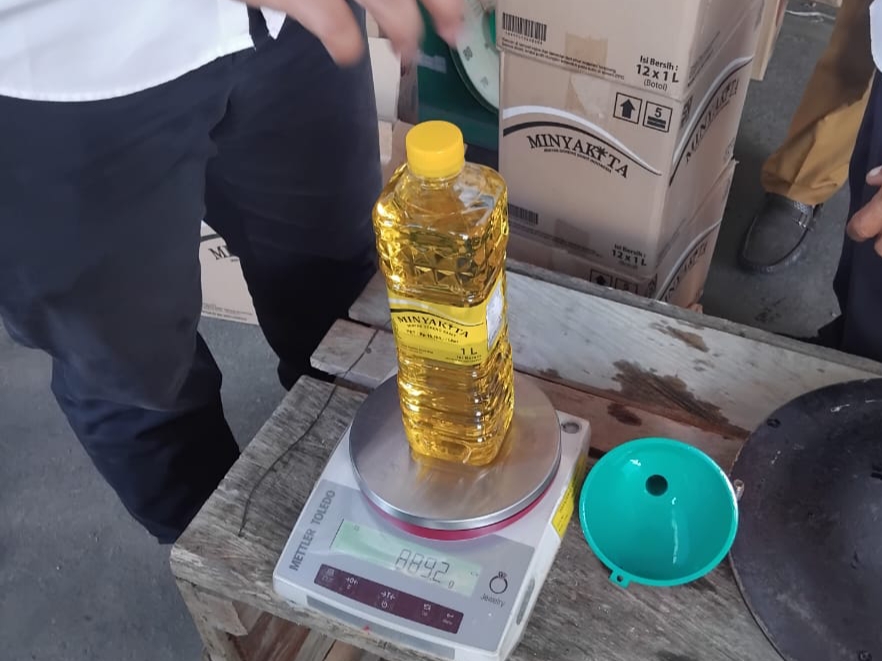 Seharusnya, setiap kemasan berisi 1 liter minyak goreng, tapi ditemukan perbedaan volume yang mencurigakan, baik di tingkat pedagang pasar maupun distributor.