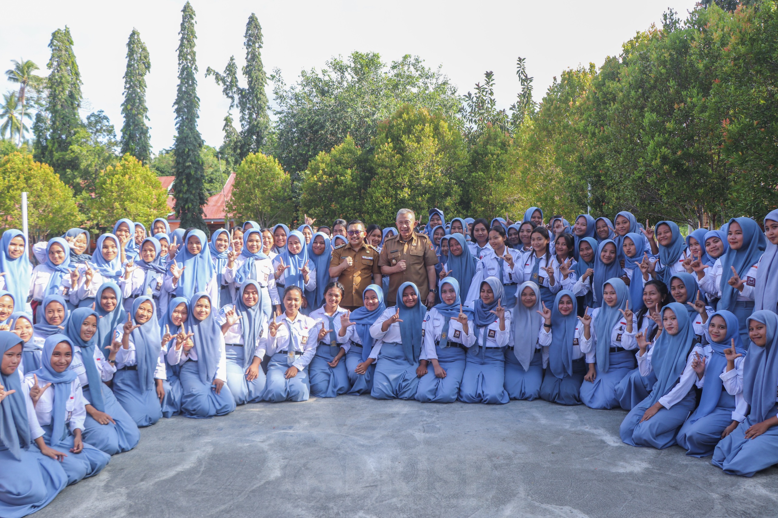 Bupati Banggai Amirudin dan Wakil Bupati Furqanuddin Masulili foto bersama siswi SMA Negeri 1 Bualemo pada Senin, 2 September 2024. (DKISP Banggai)
